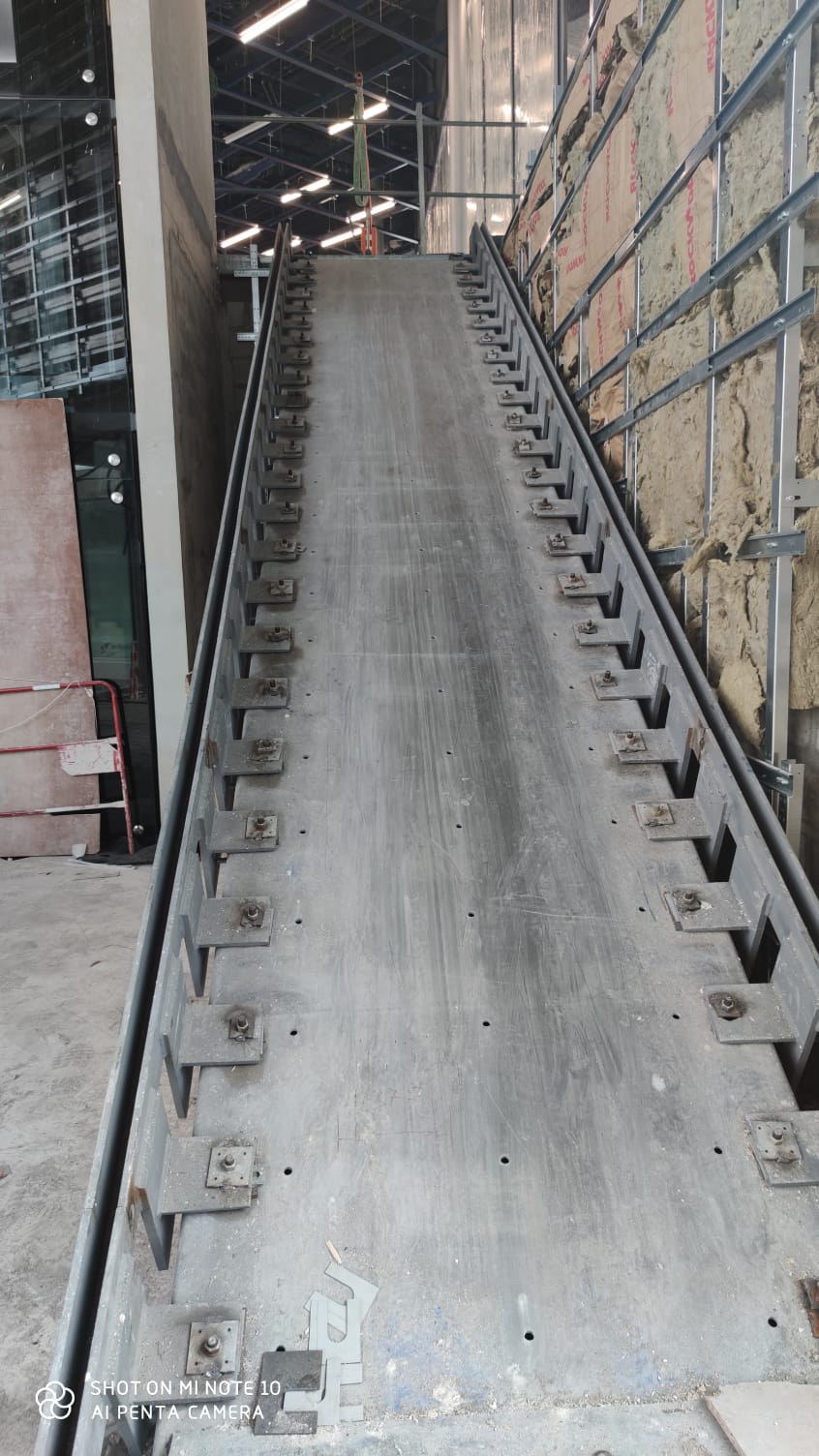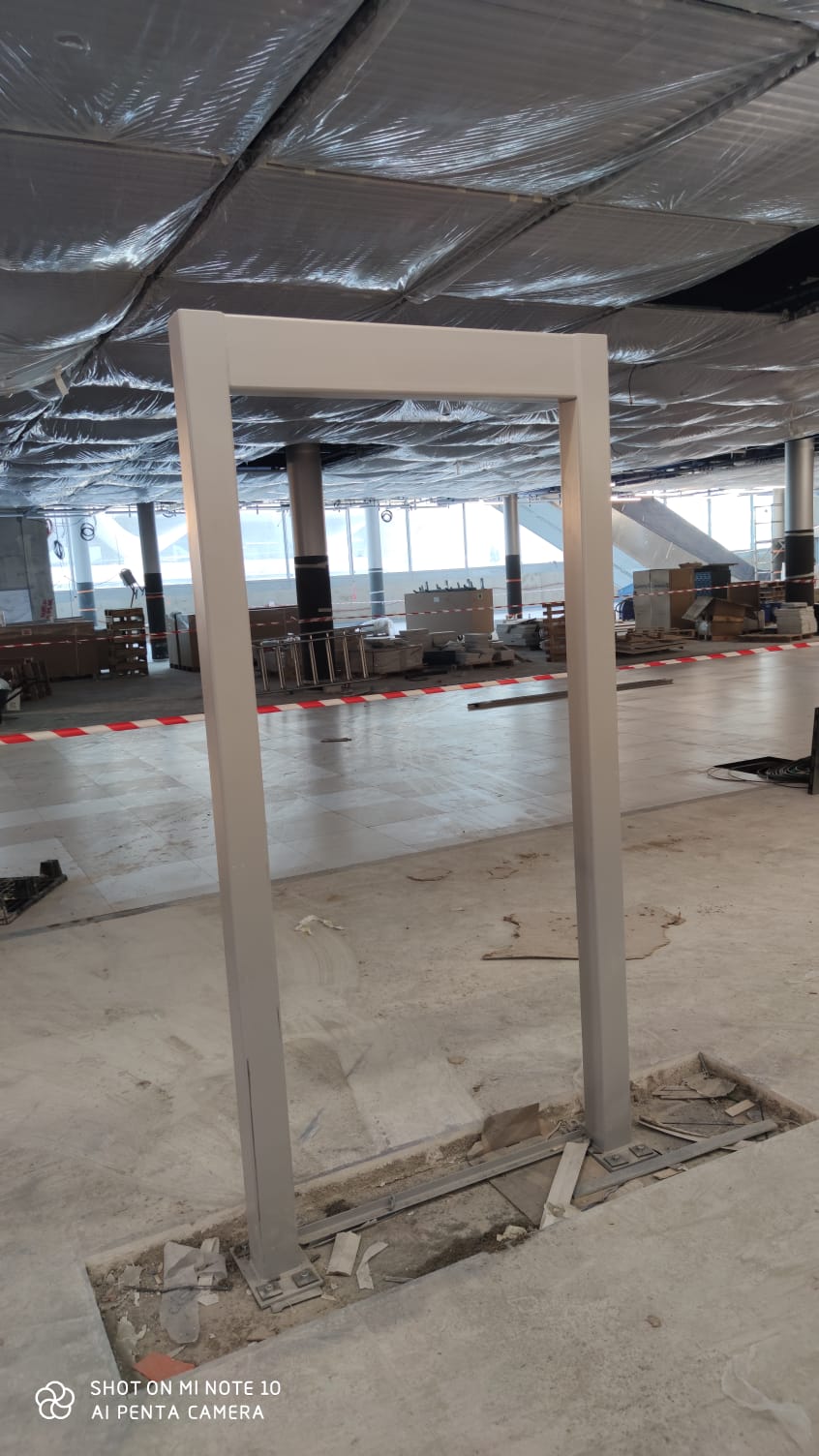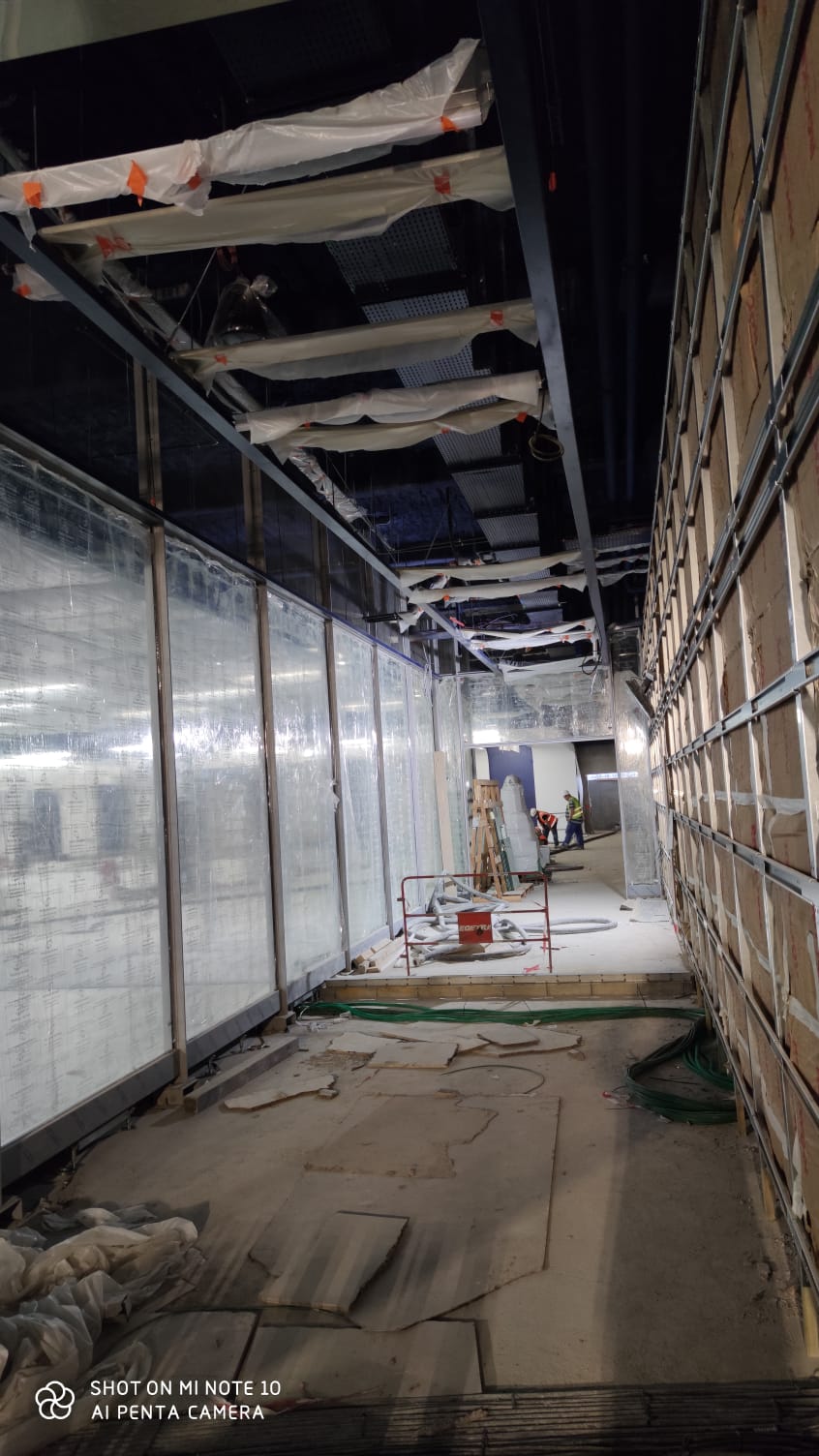 : habillage inox mur et plafond, mains courantes acier, portes sorties de secours, façades de commerces, structures plafond en métal avec dispositions de panneaux LED.